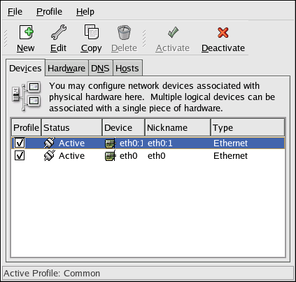 Figure 19-21 shows an example of one alias for the eth0 device. Notice the eth0:1 device — the first alias for eth0. The second alias for eth0 would have the device name eth0:2, and so on. To modify the settings for the device alias such as whether to activate it at boot time and the alias number, select it from the list and click the Edit button.