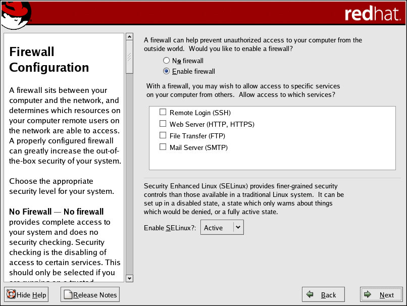 No firewall provides complete access to your system and does no security checking. Security checking is the disabling of access to certain services. This should only be selected if you are running on a trusted network (not the Internet) or plan to do more firewall configuration later.