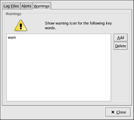 Log Viewer can be configured to display an alert icon beside lines that contain key alert words and a warning icon beside lines that contain key warning words.