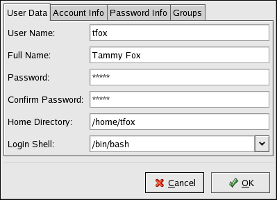 User Data — Shows the basic user information configured when you added the user. Use this tab to change the user's full name, password, home directory, or login shell.